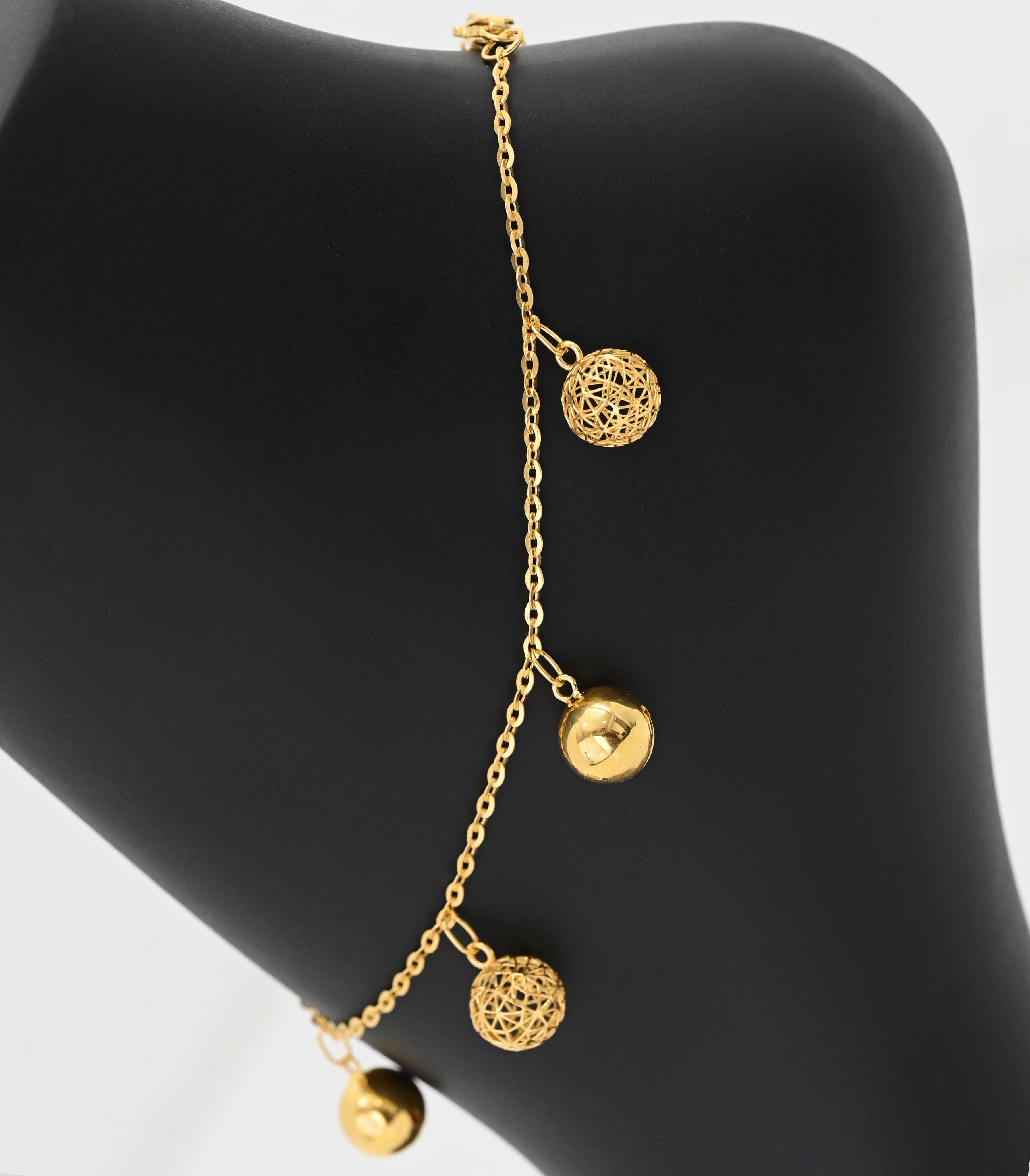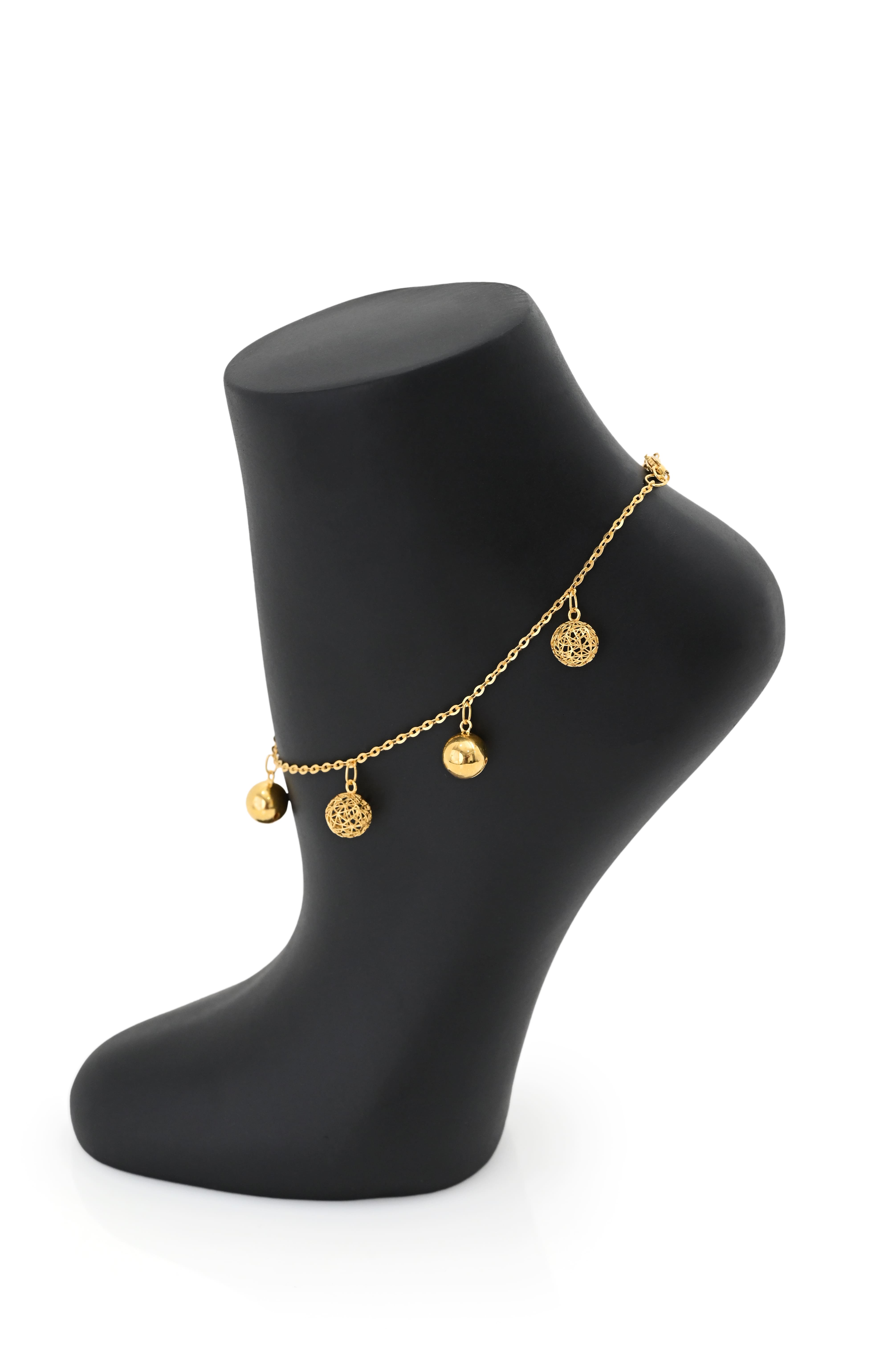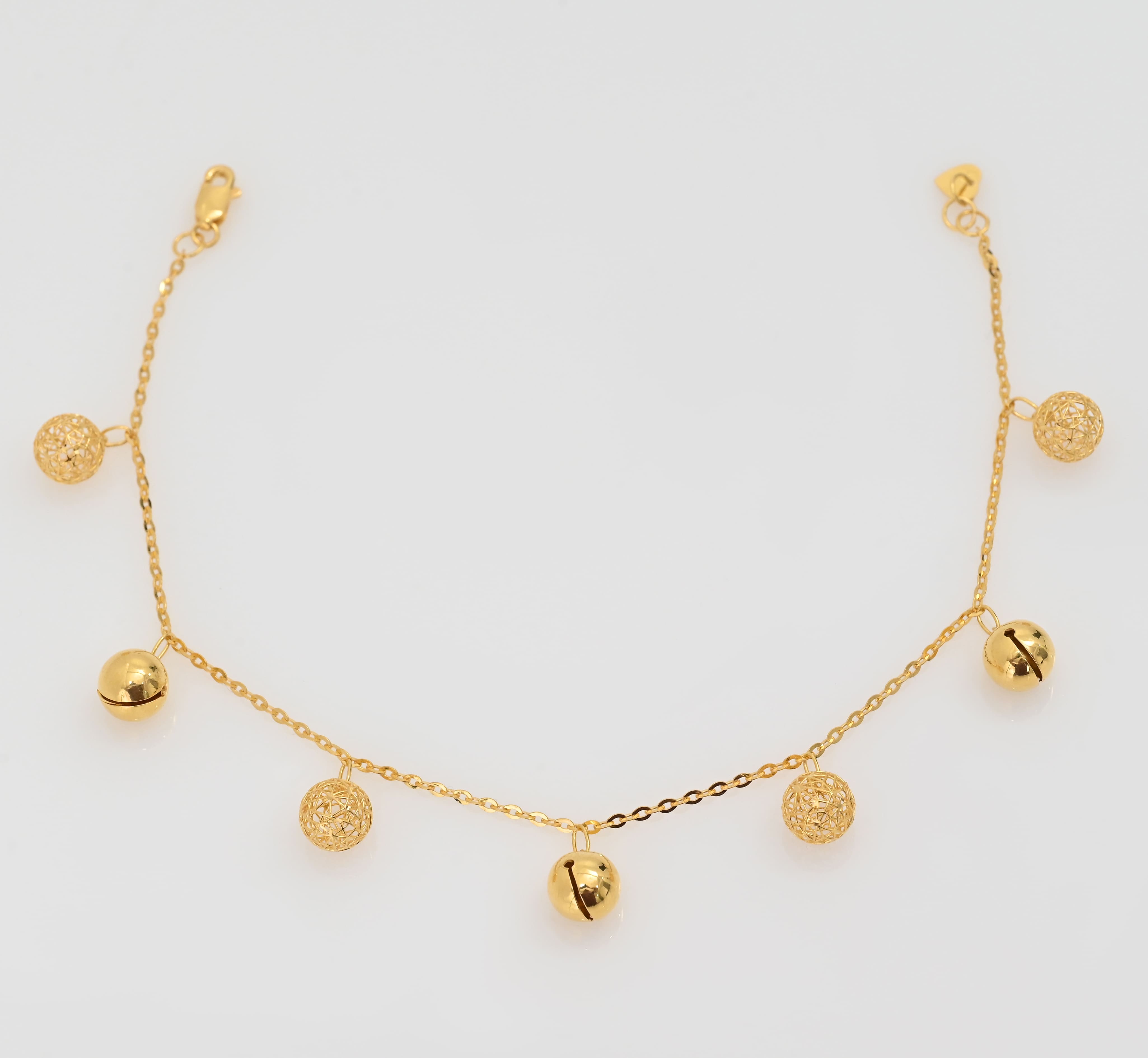 يتميز بتصميم ناعم تتدلى منه كرات ذهبية صغيرة تضفي حركة رشيقة ولمعانًا يخطف الأنظار مع كل خطوة.